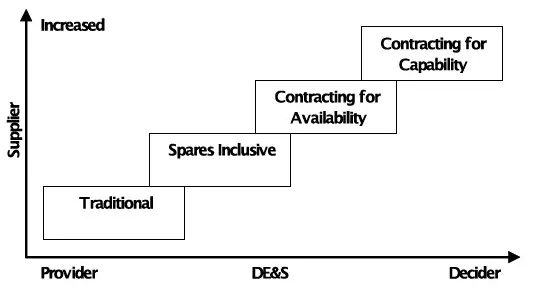 Moving from a traditional model to contracting for capability has not been framed as a one-step process. The UK MoD sets out a ‘transformational’ staircase model which includes four steps: traditional, spares inclusive, contracting for availability, and contracting for capability.