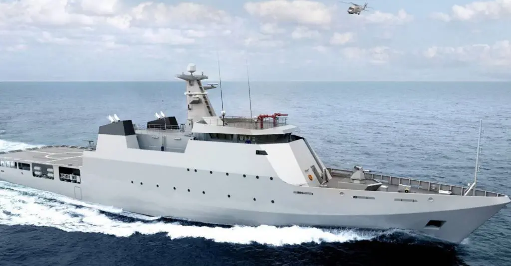As per Damen, the OPV 1800 – while slightly shorter at 83 m in length – has a top speed of 22 knots and displacement of 1,800 tons. It has a ferry range of 5,000 nm and endurance of 30 days. The flight deck and hangar can support a naval helicopter of up to 11 tons (the Sea King has a total weight of 9.7 tons).