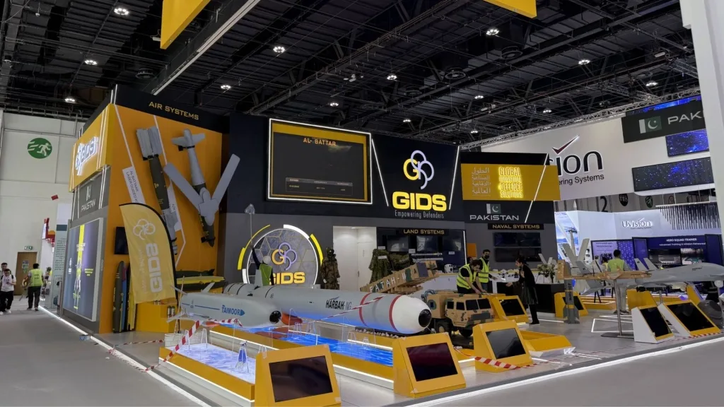 Global Industrial & Defence Solutions (GIDS), a state-owned enterprise (SOE) that commercially represents many of Pakistan’s other defence SOEs, displayed the Fatah-series of guided rockets, Blaze family of loitering munitions, AZB-line of precision-guided bombs (PGB), and the Harbah NG anti-ship cruising missile (ASCM) as well as Taimur air-launched cruise missile (ALCM).
