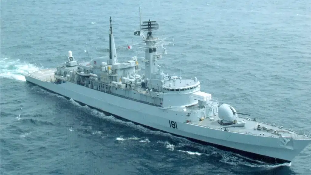 When it was in service with the Royal Navy (RN), PNS Tariq was the HMS Ambuscade. It was the fourth of eight Type 21 frigates built for the RN between 1974 and 1978. It served in the Falklands War, during which it operated at sea for 83 days. The ship also suffered a collision with the USS Dale in 1983.