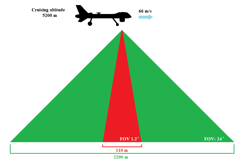 Next, a stationary target will remain in the wide FOV for a maximum of 33 seconds based on the cruise speed. Finally, the narrow FOV needs to rotate at a rate of  0.7/s only, which is entirely realistic.