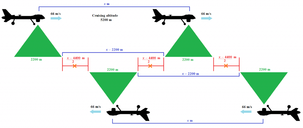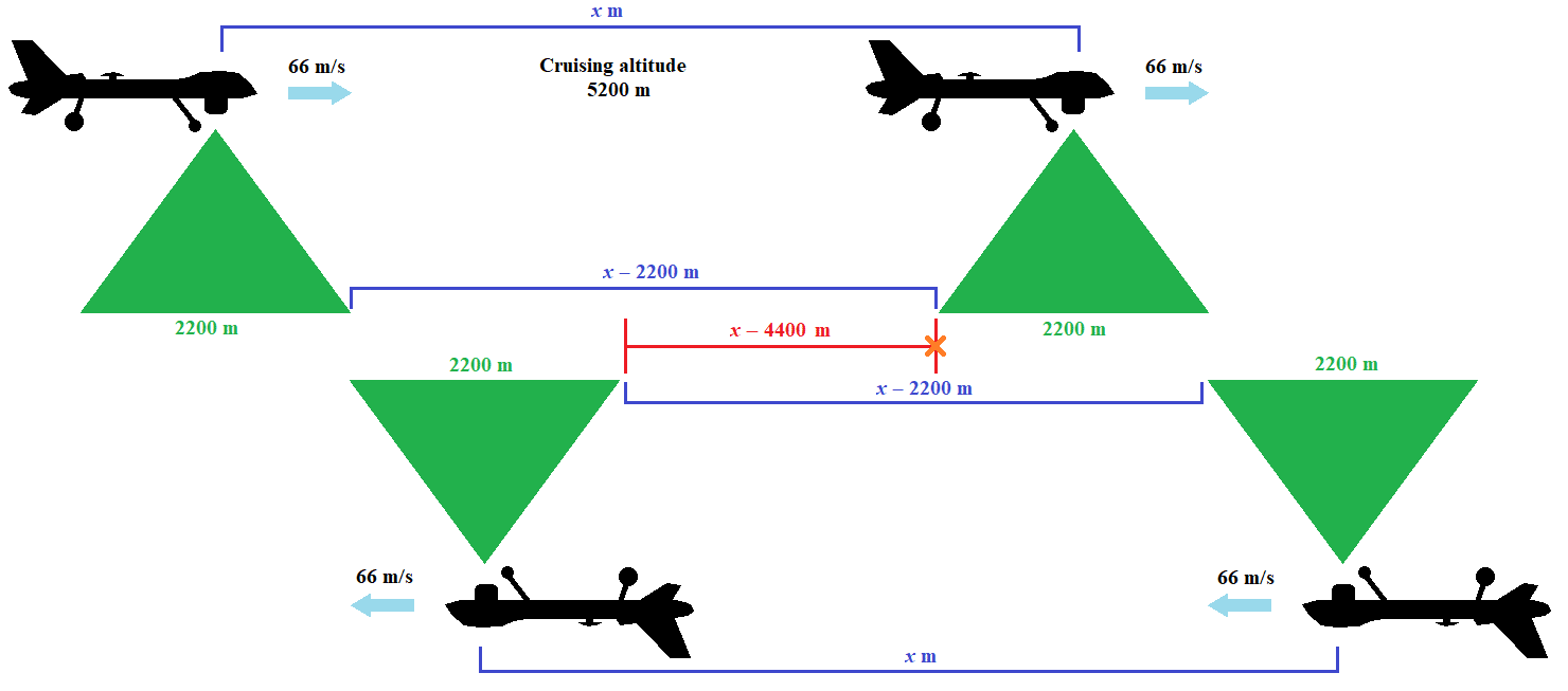 Assume that the distance between UAVs x is much greater than 2,200 m. Consider Figure 6, which shows that the target will be detected in 2,200/66=33 s by the UAV flying towards the left.