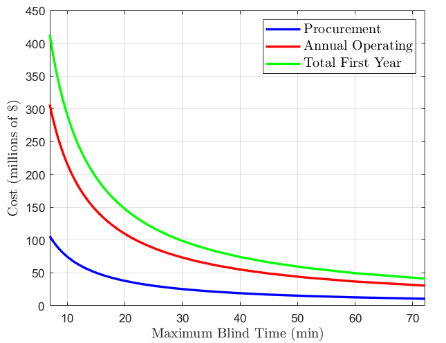 Figure 9 Procurement and operating costs for the entire border surveillance program versus maximum blind time in minutes