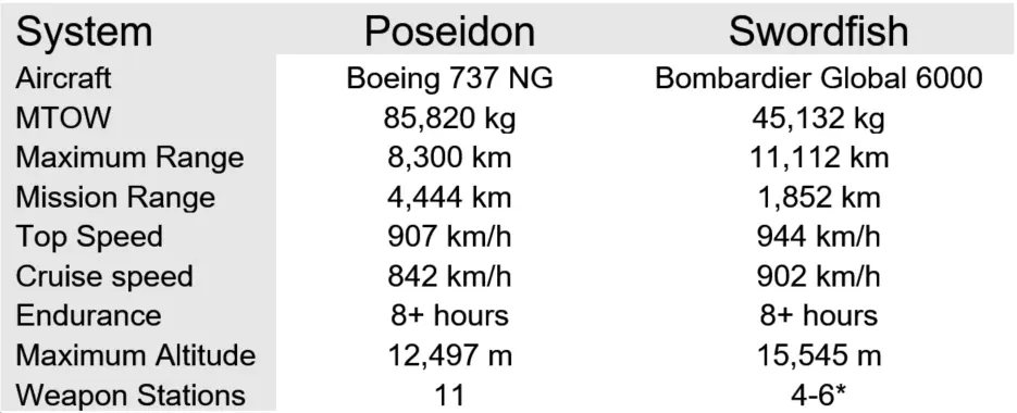 Saab is positioning the Swordfish as a AShW and ASW-capable asset, at least in its Global 6000 form. The Bombardier Global 6000 was introduced in 2003 as a long-range and long-endurance executive transport. The Global 6000 has a maximum take-off weight (MTOW) of 45,132 kg. The Boeing P-8 Poseidon, which Saab views as its principal competitor, has a MTOW of 85,820 kg.